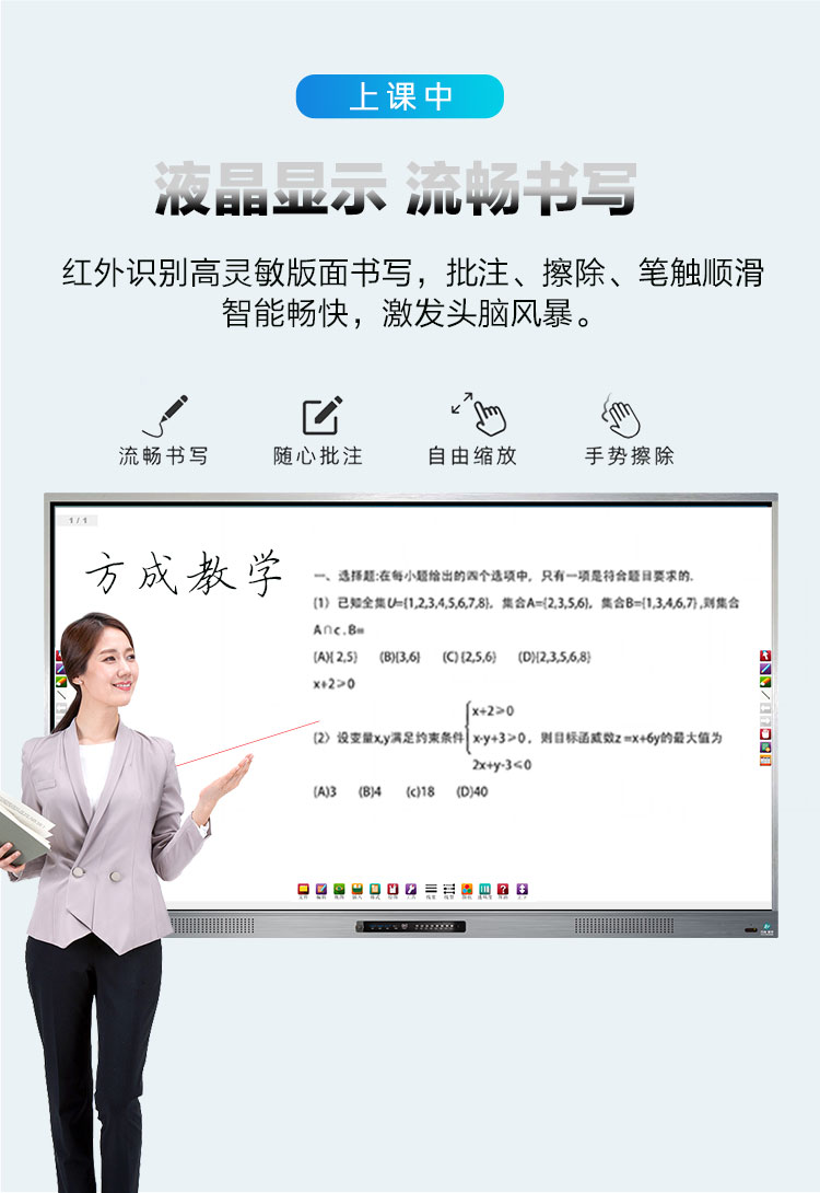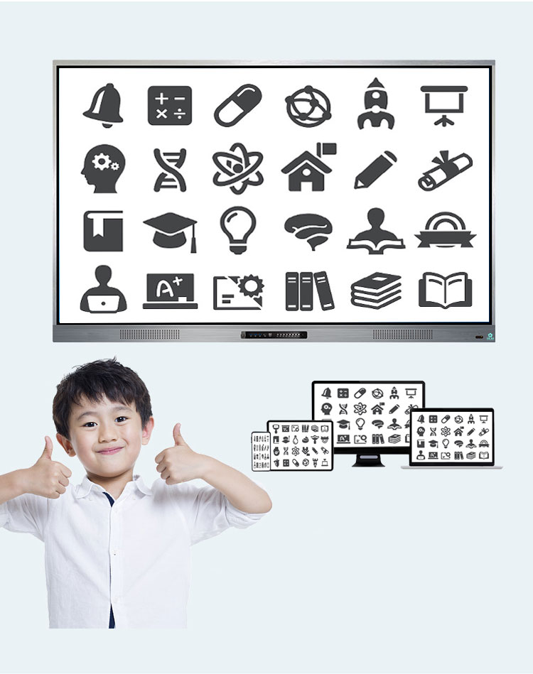 超窄邊多媒體教學91视频免费版下载(帶移動支架)-超窄邊框三等邊超窄邊框設計,推拉門鎖保護,4K超高清顯示,以人機交互的方式,搭載互動白板和無線投屏軟件,實現多人書寫、互聯互通的互動教學模式,豐富課堂內容,提高學習氛圍。